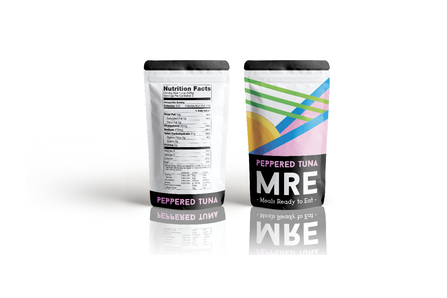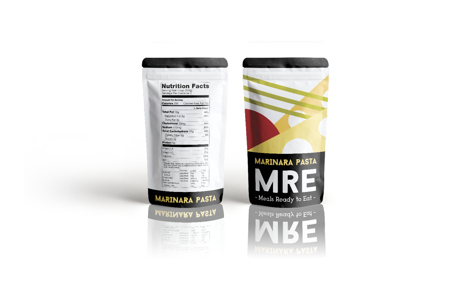 MRE are usually associated with either the military or camping. Therefore, their branding is usually plain and direct. When rebranding this product, I wanted to keep the design direct and simple. However, I also wanted to create a more appealing and colorful product. Since this product is for preserved (freeze dried) foods, the perception of freshness and taste needed to be conveyed. This is accomplished in the rebrand through a modern / clean look, simple and colorful illustrations, and meaningful typography.