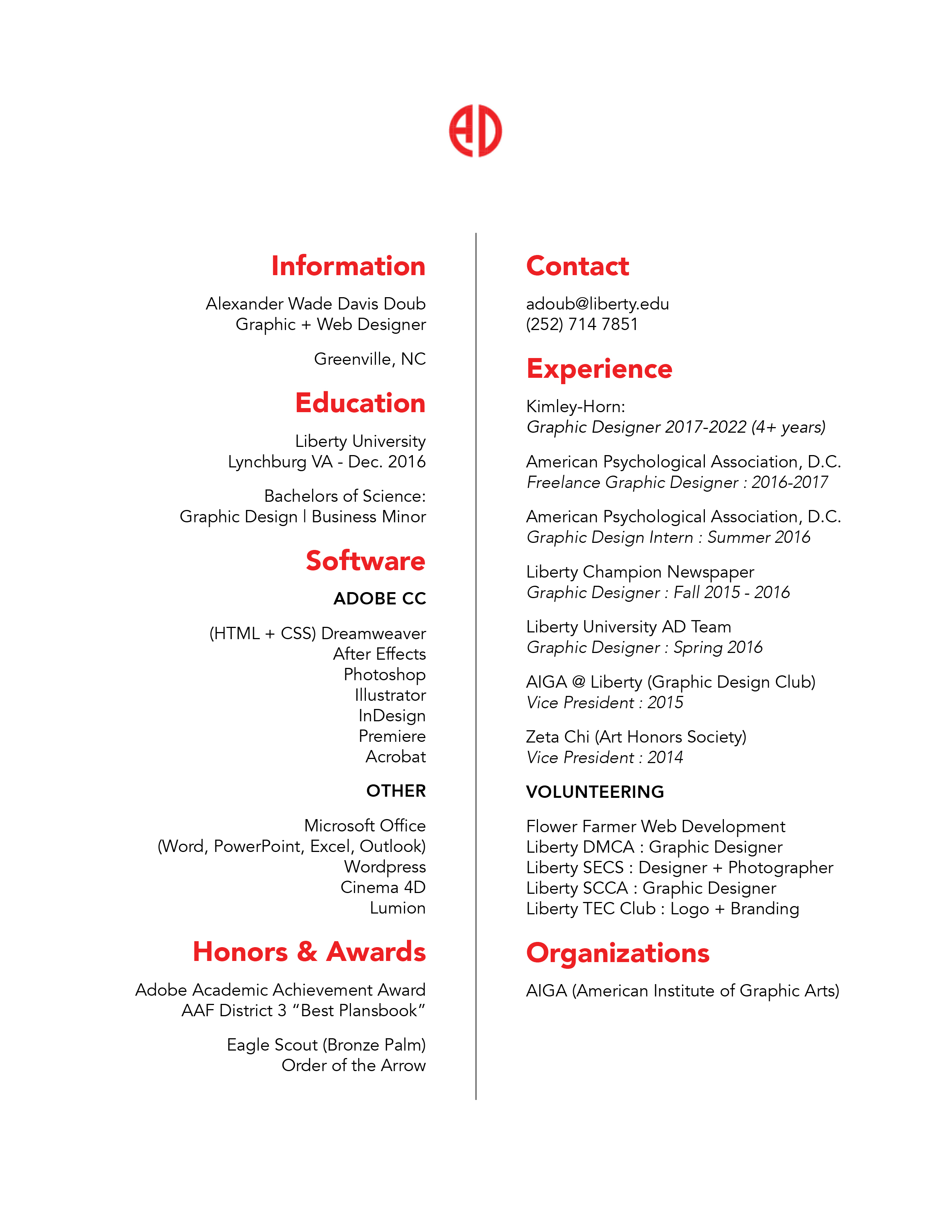My name is Alex Doub (Alexander Wade Davis Doub). I studied Graphic Design at Liberty University, where I was fortunate enough to be involved in many different projects and groups that benefitted from my talent in design. As a designer, I believe that good design comes from a solid understanding of an idea and its purpose. This understanding creates a more unique and individual branding, while also creatively displaying and communicating that idea with purpose. I believe design is more than simply making something look appealing or attractive. Design is about creating a feeling and communicating an idea through strong, impactful visuals.