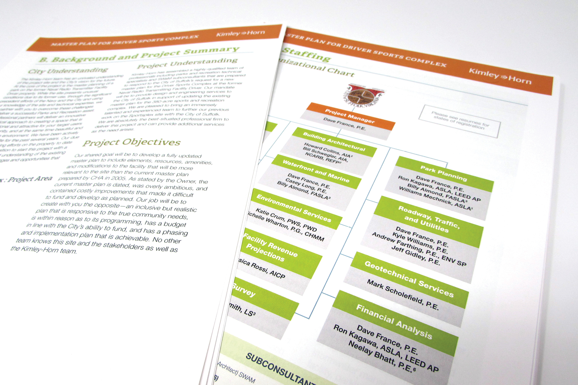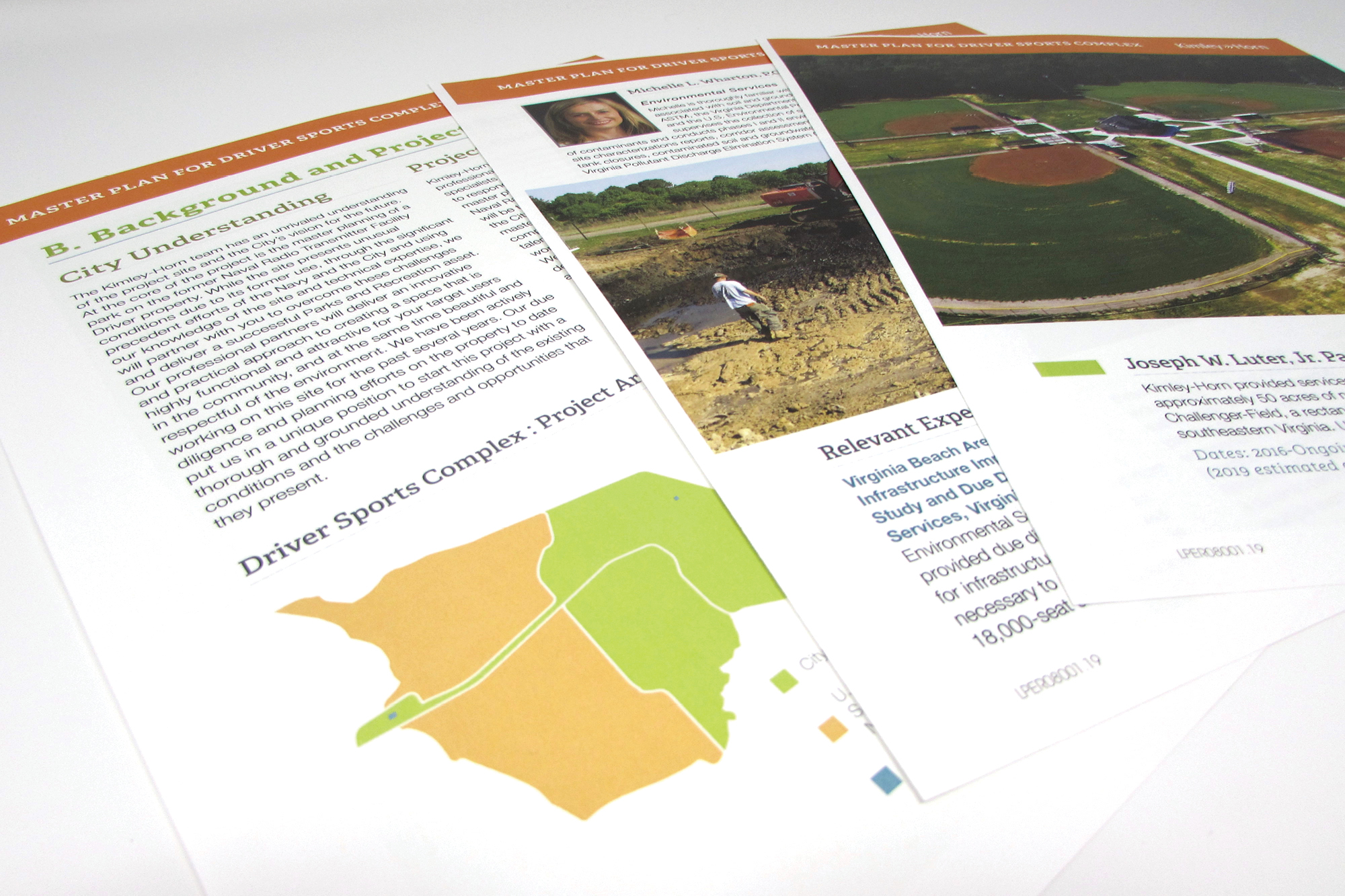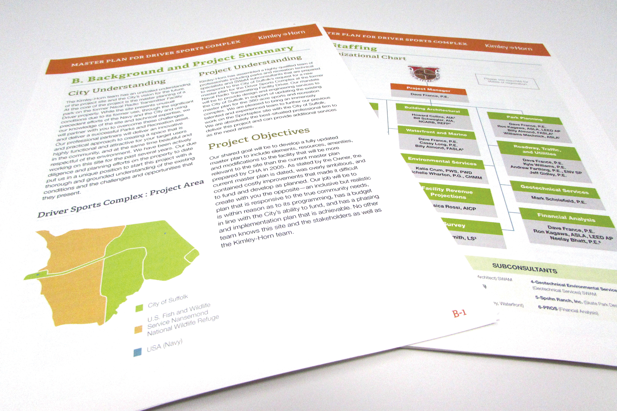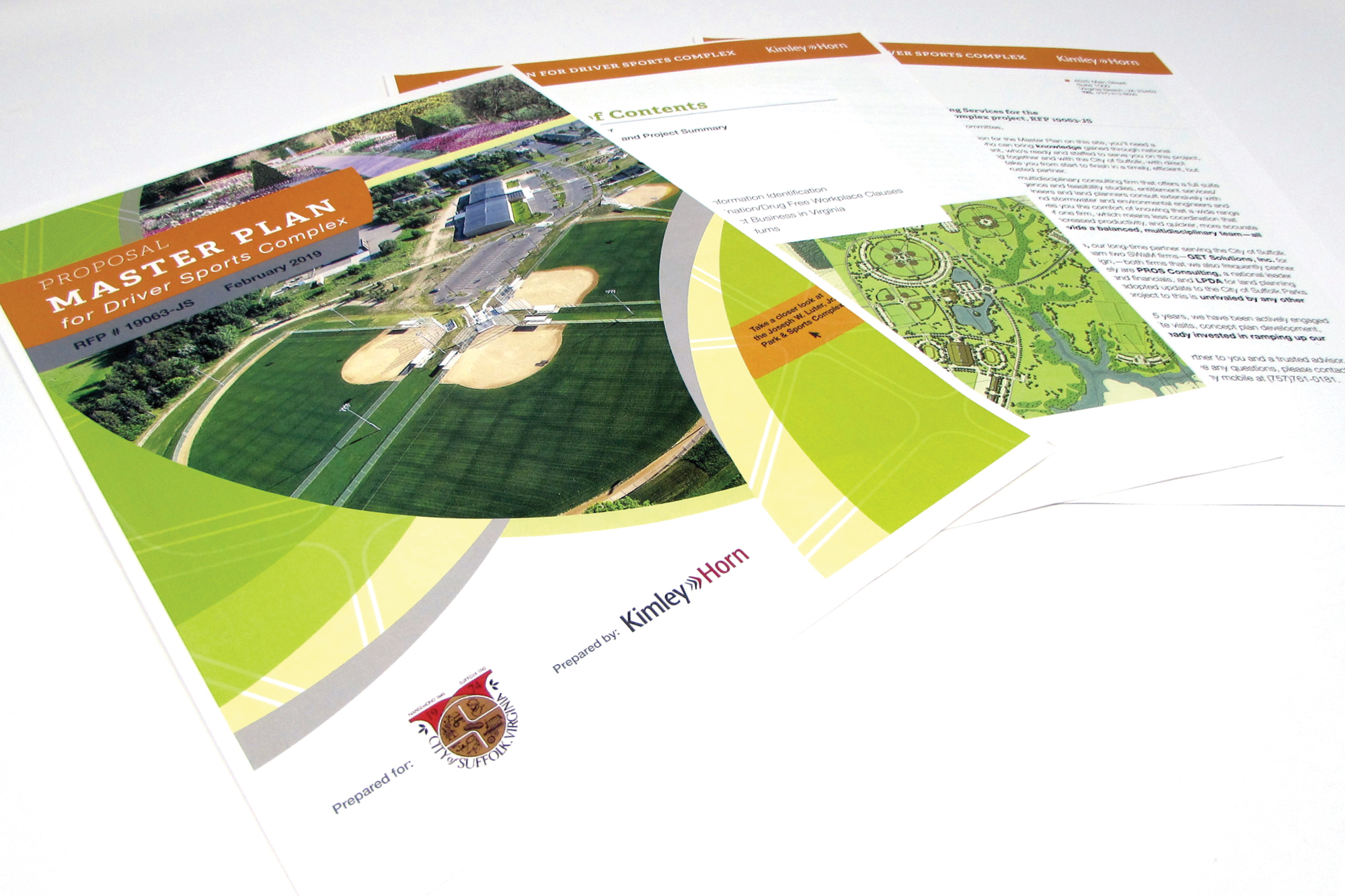 This proposal was compiled for the city of Suffolk,VA to present a Master Plan for the Driver Sports Complex. The proposal composed of a front/back cover, cover letter, project approach, staff resumes, and relevent icons/graphics.