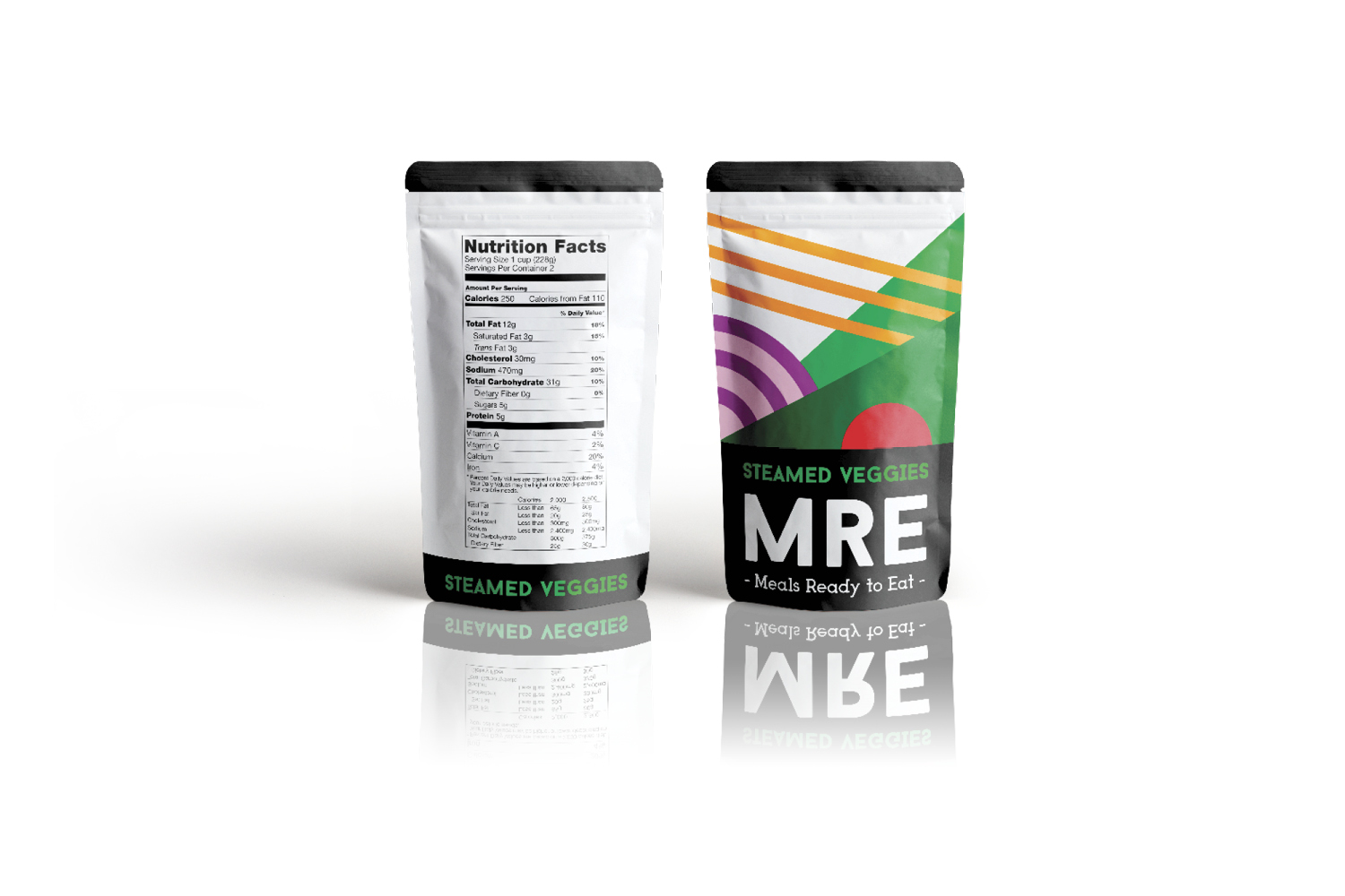 MRE are usually associated with either the military or camping. Therefore, their branding is usually plain and direct. When rebranding this product, I wanted to keep the design direct and simple. However, I also wanted to create a more appealing and colorful product. Since this product is for preserved (freeze dried) foods, the perception of freshness and taste needed to be conveyed. This is accomplished in the rebrand through a modern / clean look, simple and colorful illustrations, and meaningful typography.