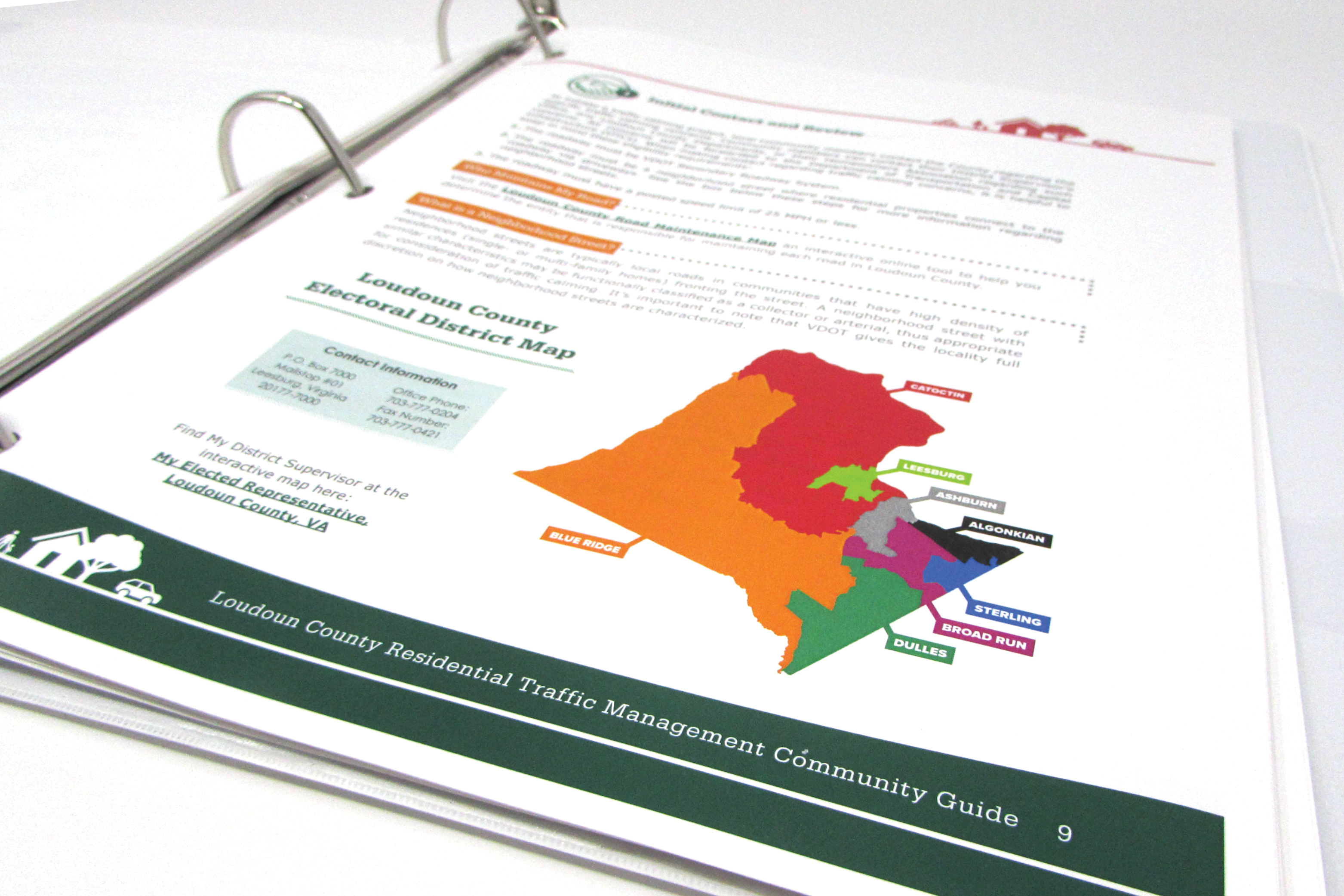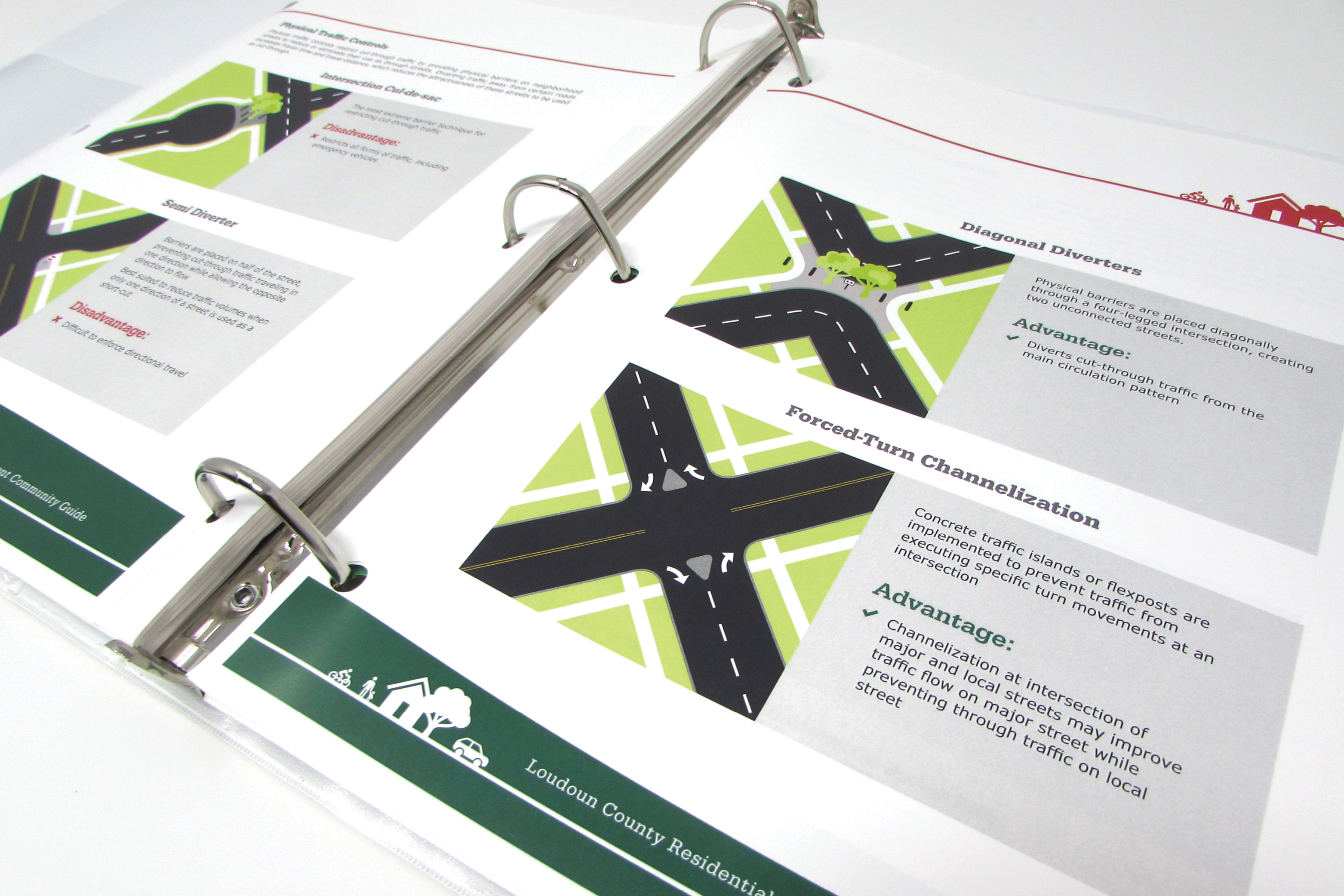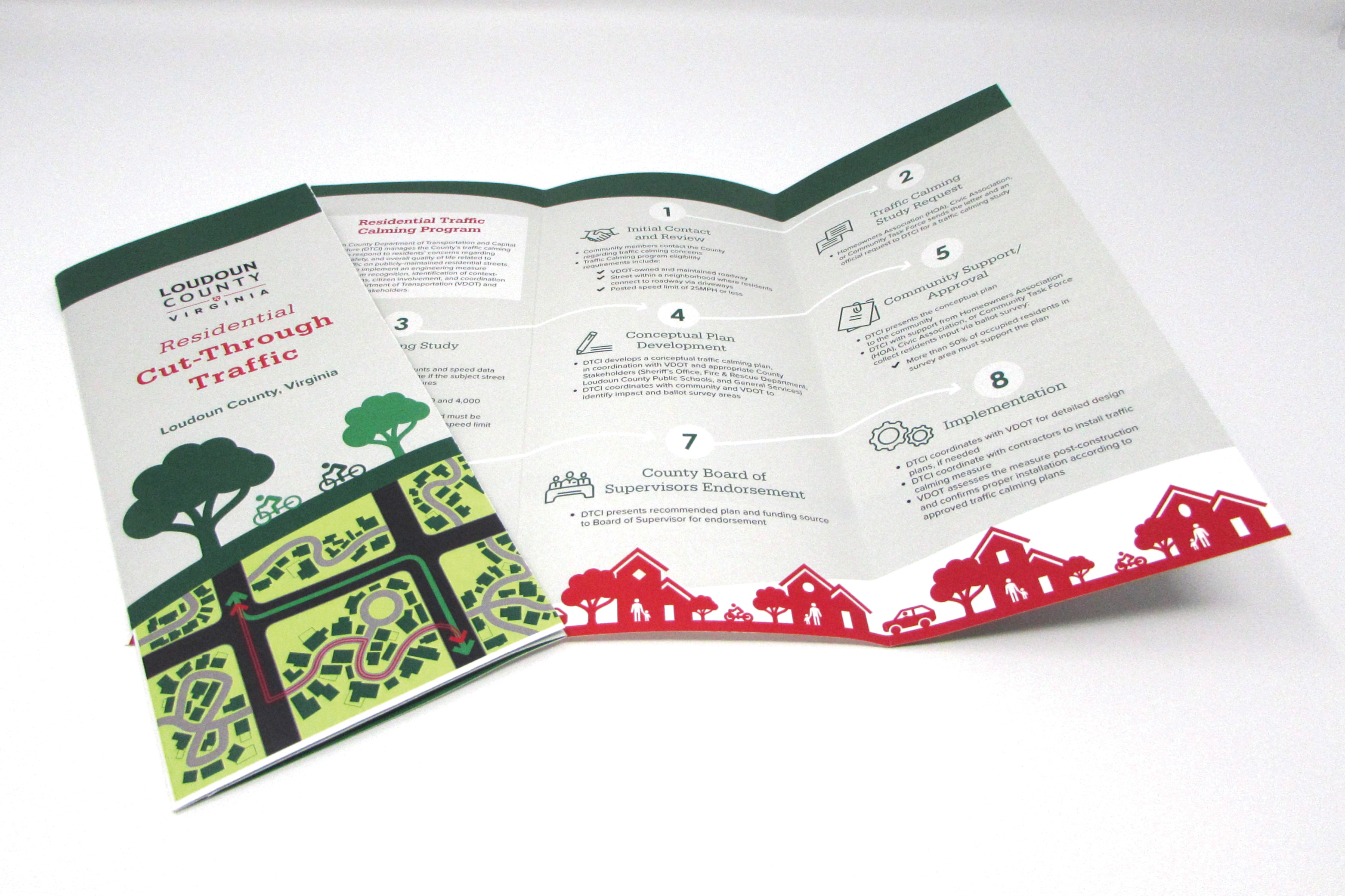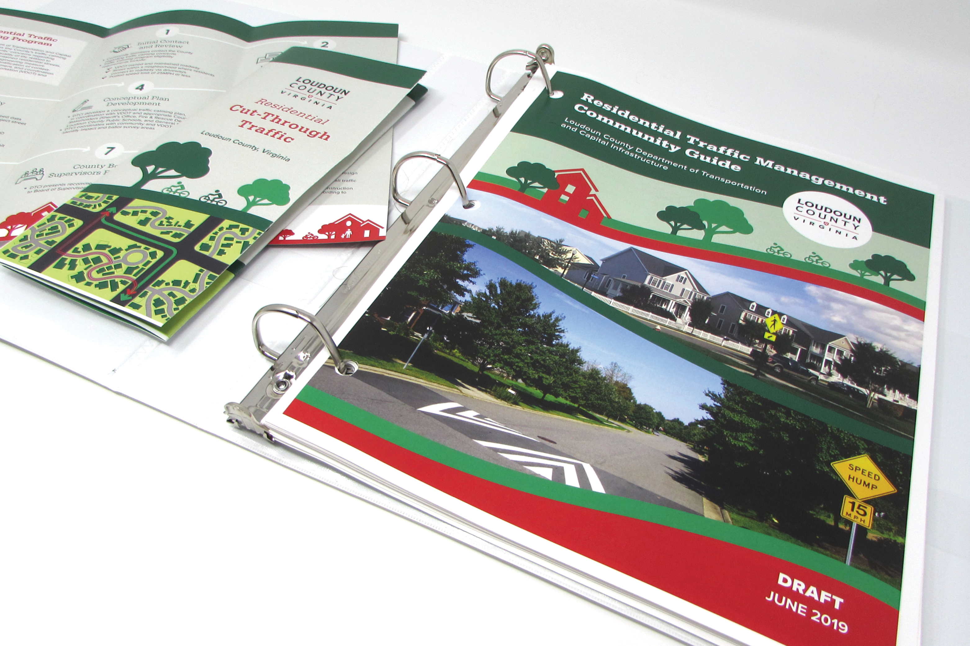 Loudoun County requested materials detailing the traffic management changes that would be implemented in local communities. The first material produced was a traffic management guide that contained all changes/adjustments to traffic in the community. The guide summarized the process by which these changes would be introduced, approved or denied, communicated to the community, adjusted based on feedback, and then implemented. Brochures were also produced to go along side the traffic mamagement guide and summerize specific changes to traffic or traffic flow in the community.