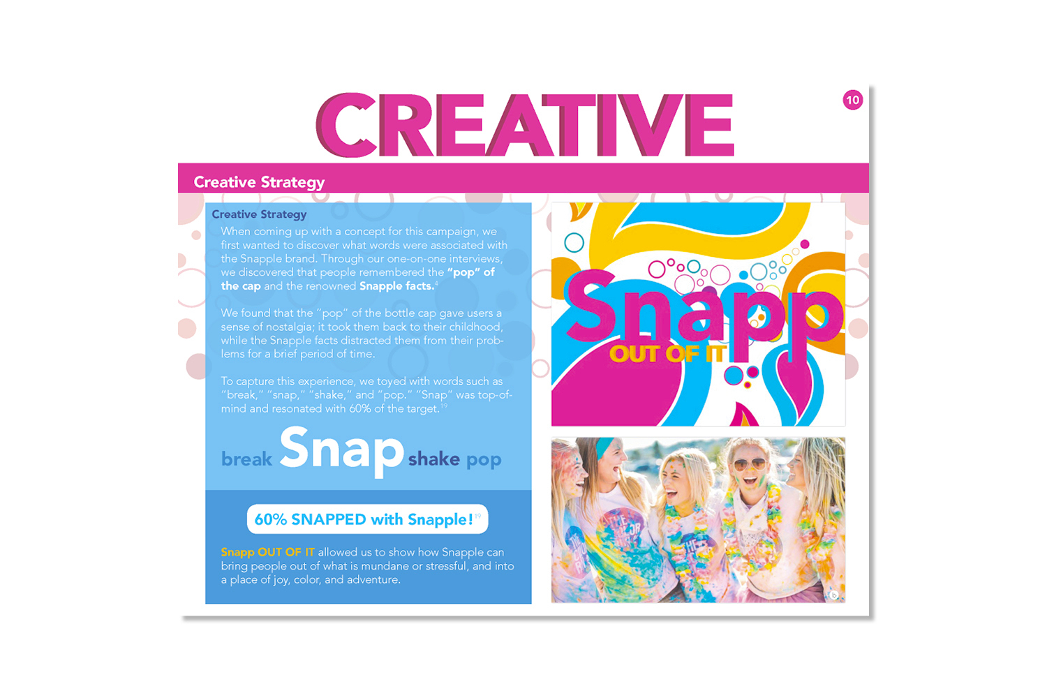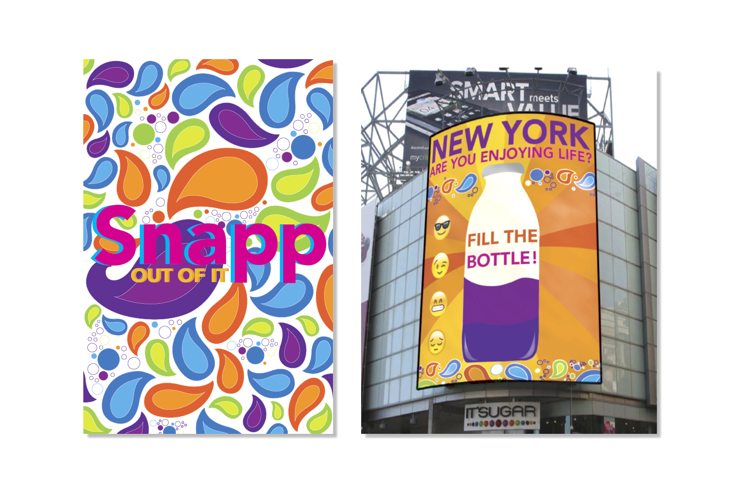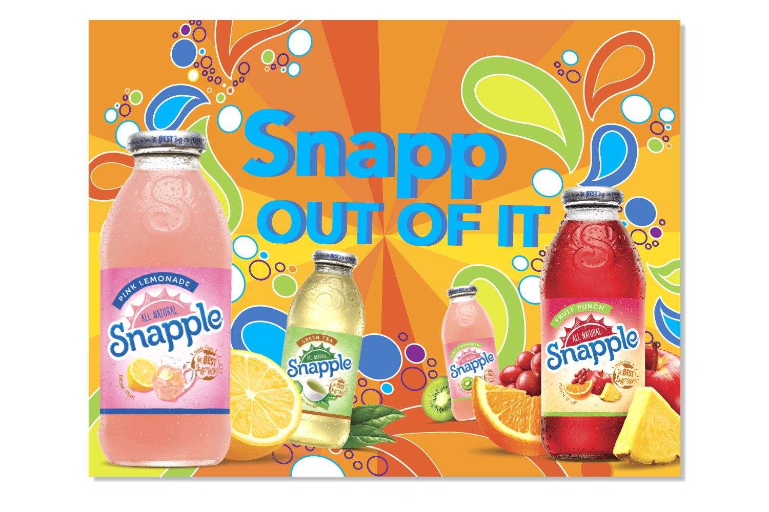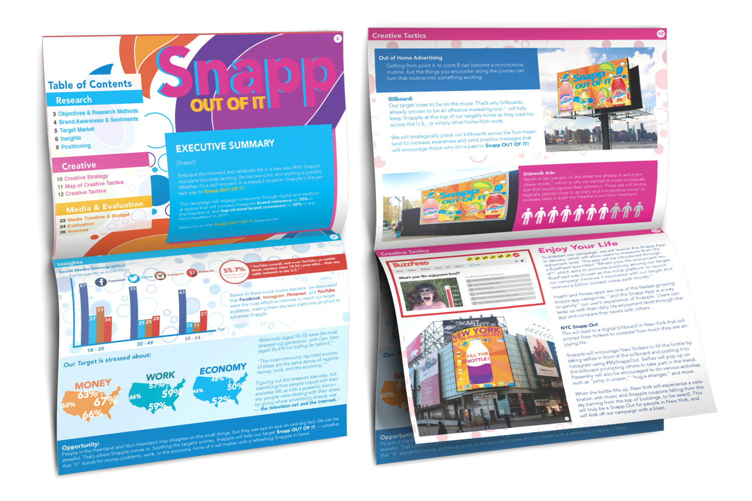The Snapp out of it campaign is an initiative to entice loyal consumers to drink more and encourage others to try Snapple products. This campaign is focused on bringing zest and happiness to an otherwise boring day, or in other words to "Snapp out of it". In terms of design, I wanted to communicate the "zest and happiness" felt after drinking Snapple. This was accomplished by using bright colors and organic patterns. Overall this campaign was a success, winning "best plansbook", "best presenter", and third place overall at an NAAF regional competition.