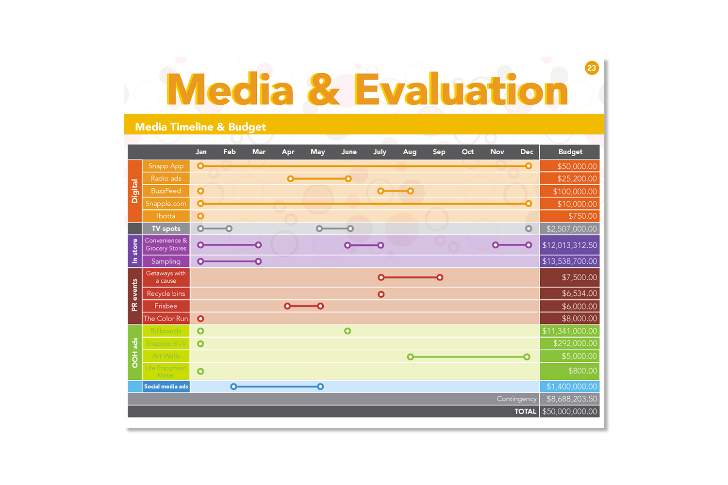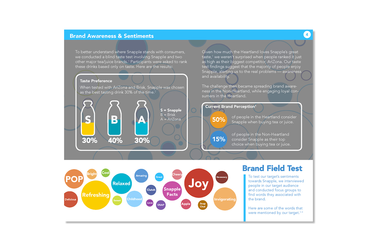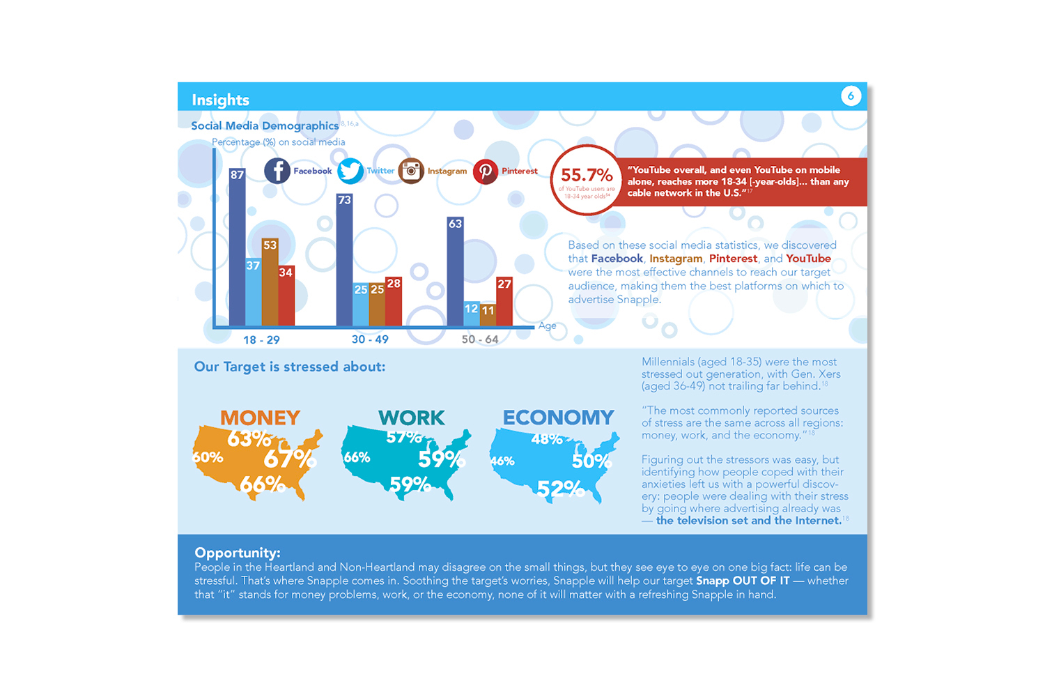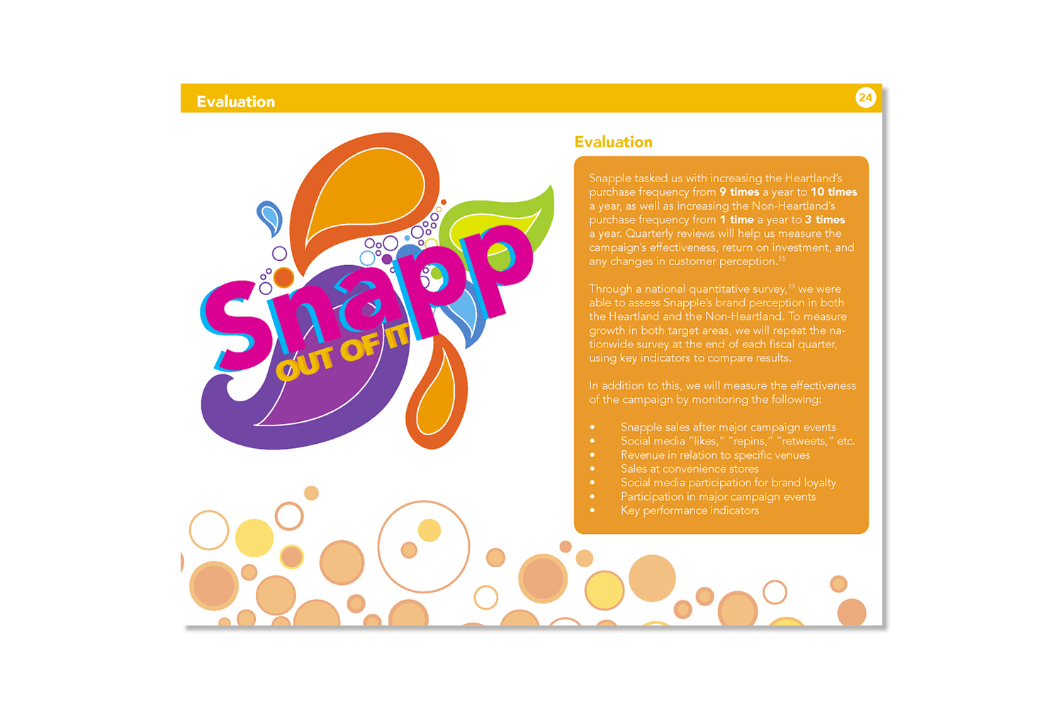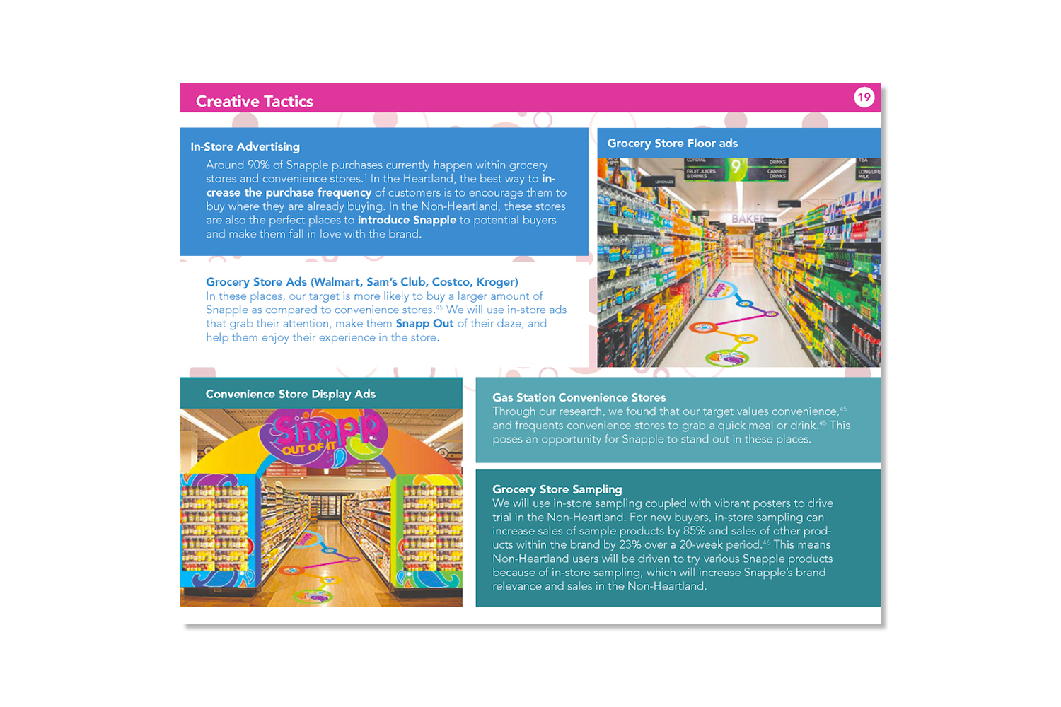 The Snapp out of it campaign is an initiative to entice loyal consumers to drink more and encourage others to try Snapple products. This campaign is focused on bringing zest and happiness to an otherwise boring day, or in other words to "Snapp out of it". In terms of design, I wanted to communicate the "zest and happiness" felt after drinking Snapple. This was accomplished by using bright colors and organic patterns. Overall this campaign was a success, winning "best plansbook", "best presenter", and third place overall at an NAAF regional competition.
